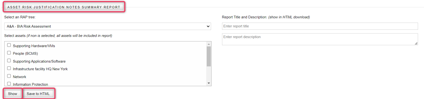 Navigate to Reports and click the Asset-Threat-Vulnerability-Justification Notes Report to view the screen as shown below.