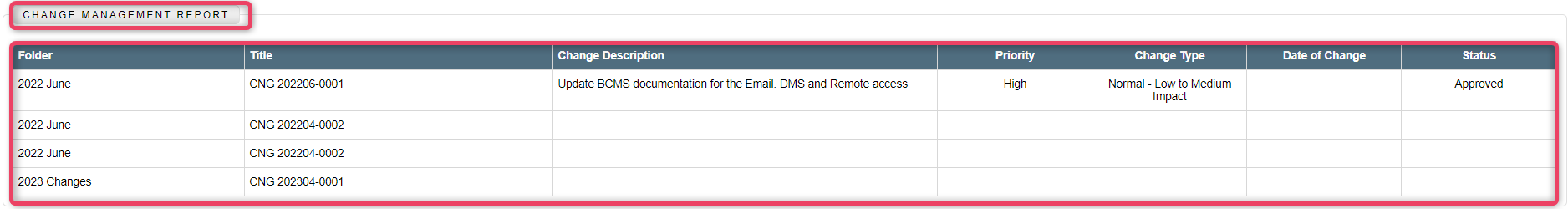 The "Change, Incident, and Planning Management" report provides an overview of changes, incidents, and planning activities within the organization. It includes records of implemented changes, reported incidents, and planning strategies. This report supports effective management of organizational changes, incident resolution, and future planning efforts